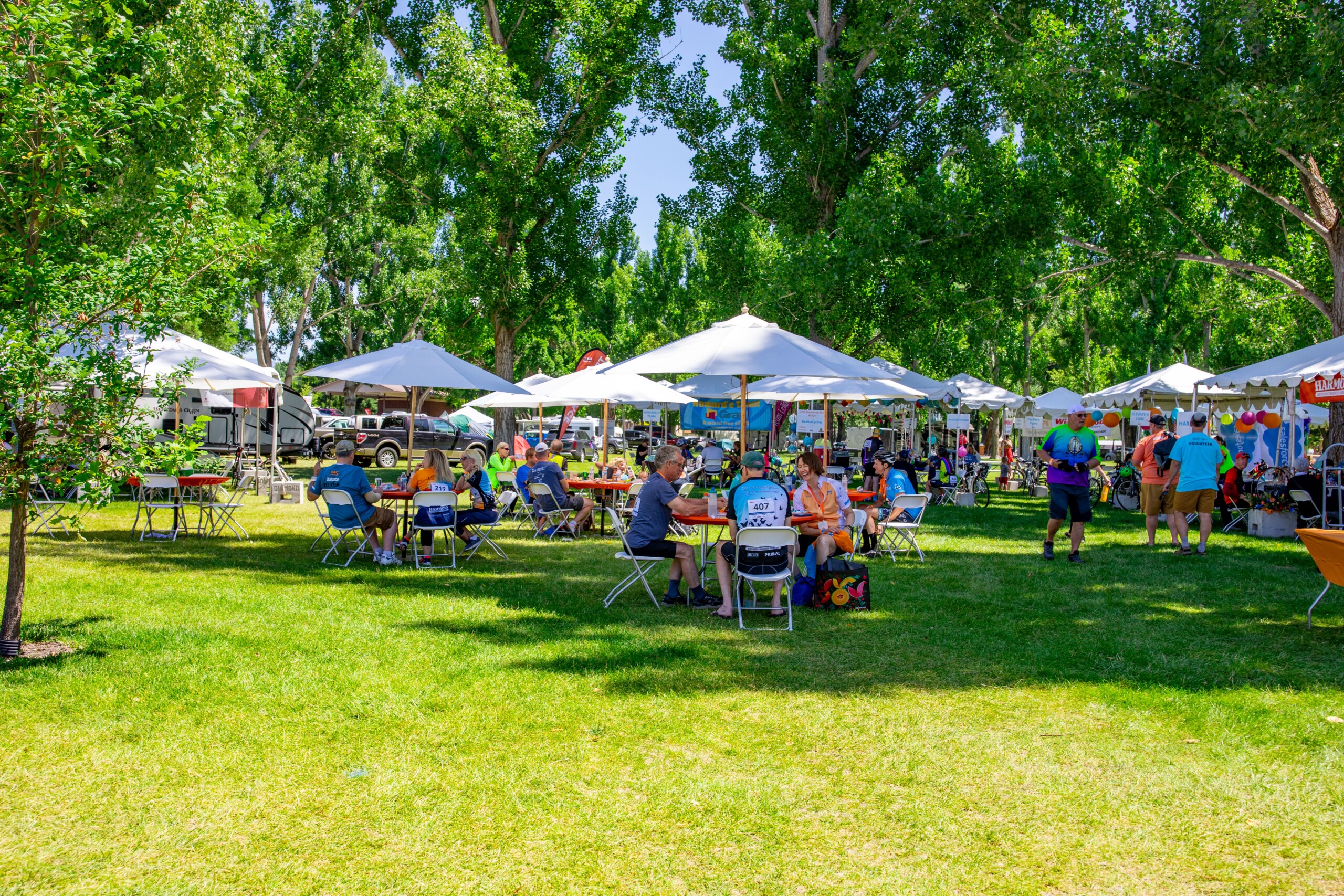 I like to leave Salt Lake on Friday and drive to Logan in time to get there around lunchtime. Upon arrival, I set up my tent, eat the lunch I brought with me, relax next to the stream, and explore the preparations for the ride. I like to park and then try to avoid driving at all until I leave on Sunday. Lunch and dinner are not served on Friday, so I bring my own. When I was working (i.e., before I retired) this was great downtime for me, spending an afternoon just relaxing by the stream, reading, and watching the children tubing by. I love that I have nothing that I have to do all weekend except to ride my bike.