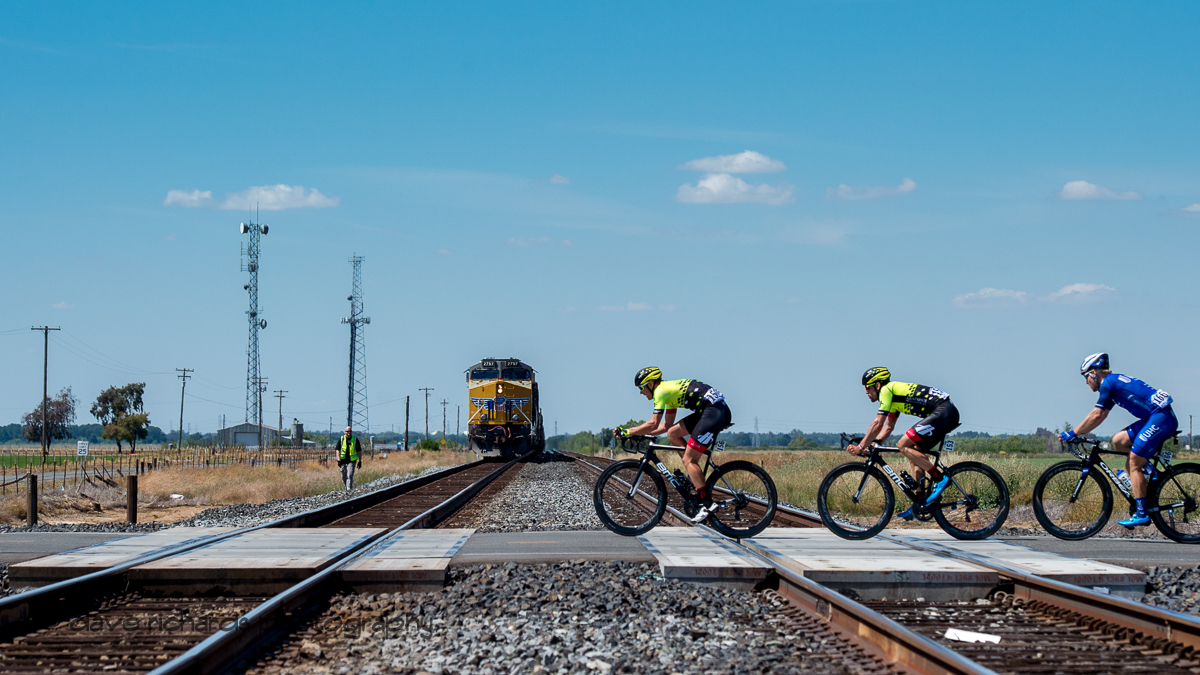 Look out! Train a comin' Not really, the train came to a stop and the riders passed through safely. Men's Stage Five, Stockton to Elk Grove, 2018 Amgen Tour of California cycling race (Photo by Dave Richards, daverphoto.com)