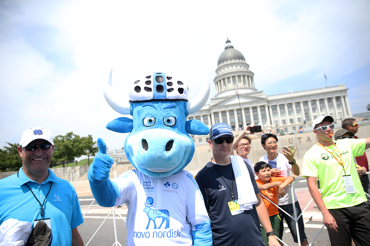 The Team Novo Nordisk Bull was out to support the riders. Tour of Utah 2017, Stage 7, Salt Lake City Circuit Race, 11 laps, 73 miles, 5450 feet of climbing. Photo by Cathy Fegan-Kim, cottonsoxphotography.net