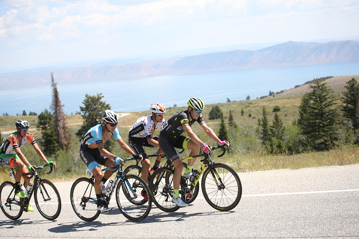 Bike racing at it's finest. Bear Lake in the background at the 2017 Tour of Utah Stage 1, Bear Lake to Logan. Photo by Cathy Fegan-Kim, Cottonsoxphotography.net