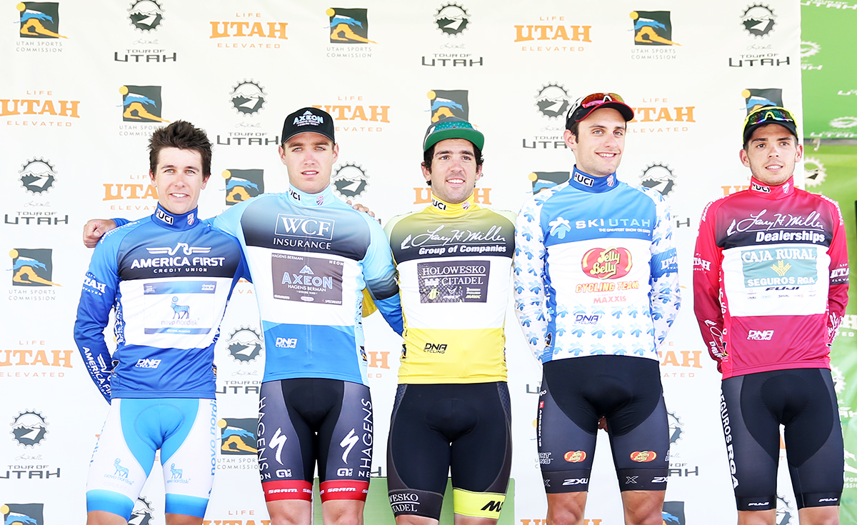 The jersey wearers after stage 1. 2017 Tour of Utah Stage 1, Bear Lake to Logan. Photo by Cathy Fegan-Kim, Cottonsoxphotography.net